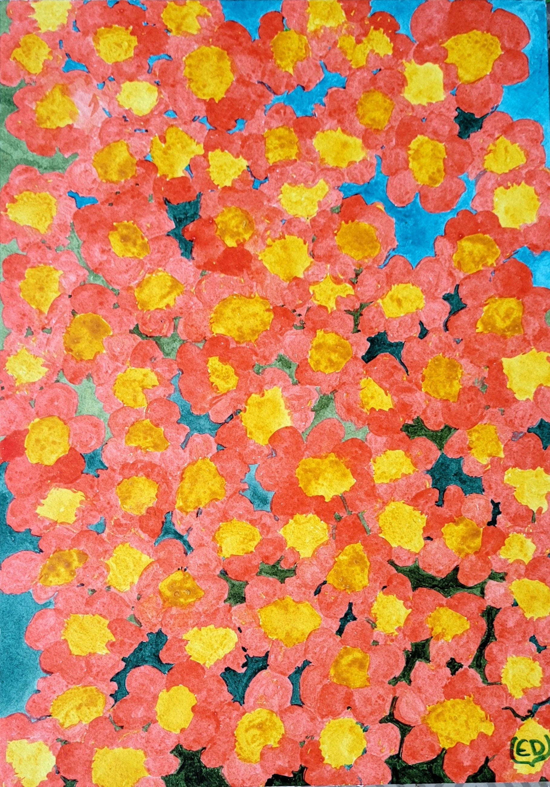 Profusion de fleurs entre ciel et terre, encre à base de gomme laque sur papier aquarelle, Eveline David-Valette